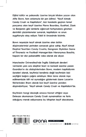 Dijital kültür ve psikanaliz üzerine birçok kitabın yazarı olan Alfie Bown, tam anlamıyla bir şen bilimci. “Keyif Almak: Candy Crush ve Kapitalizm”, bizi harekete geçiren temel parçamız olan keyif üzerine Pierre Bourdieu, Guattari, Zizek ve Benjamin gibi isimlerle eğlenceli tartışmalara girerken derinlikli çözümlemeler sunarak, kapitalizm ve onun aygıtlarıyla alay ediyor. Tabii ki öncesinde bizimle. Bown neşesiyle keyif almak üzerine olan bütün düşüncelerimizi yerinden sarsacak güce sahip. Keyif Almak Eleştirel Teori’den Candy Crush’a, Gangnam Style’dan Game of Thrones’a ve Football Manager’dan Hieronymus Bosch’a, hepsini bir dizi psikanalitik vaka olarak ele alıyor. Manchester Üniversitesi’nde İngiliz Edebiyatı dersleri vermenin yanı sıra eleştirel teori ve komedi üzerine yazan Guardian’ın da silahşörlerinden Bown, modern kapitalizmin özneleri olarak, keyfimizi kendimiz değil keyfimizin bizi seçtiğini bağıra çağıra anlatıyor. Birer özne olarak inşa edilmemizde kilit rol oynadığını göstermek üzere Lacan’ın fikirlerinden ilham alarak bizi keyif üzerine yeniden düşündürtüyor, “Keyif almak: Candy Crush ve Kapitalizm”de. Keyfinizin hangi ideolojik amaca hizmet ettiğini veya Deleuze okumanızın Candy Crush oynamaktan ne farkı olduğunu merak ediyorsanız bu kitaptan keyif alacaksınız.